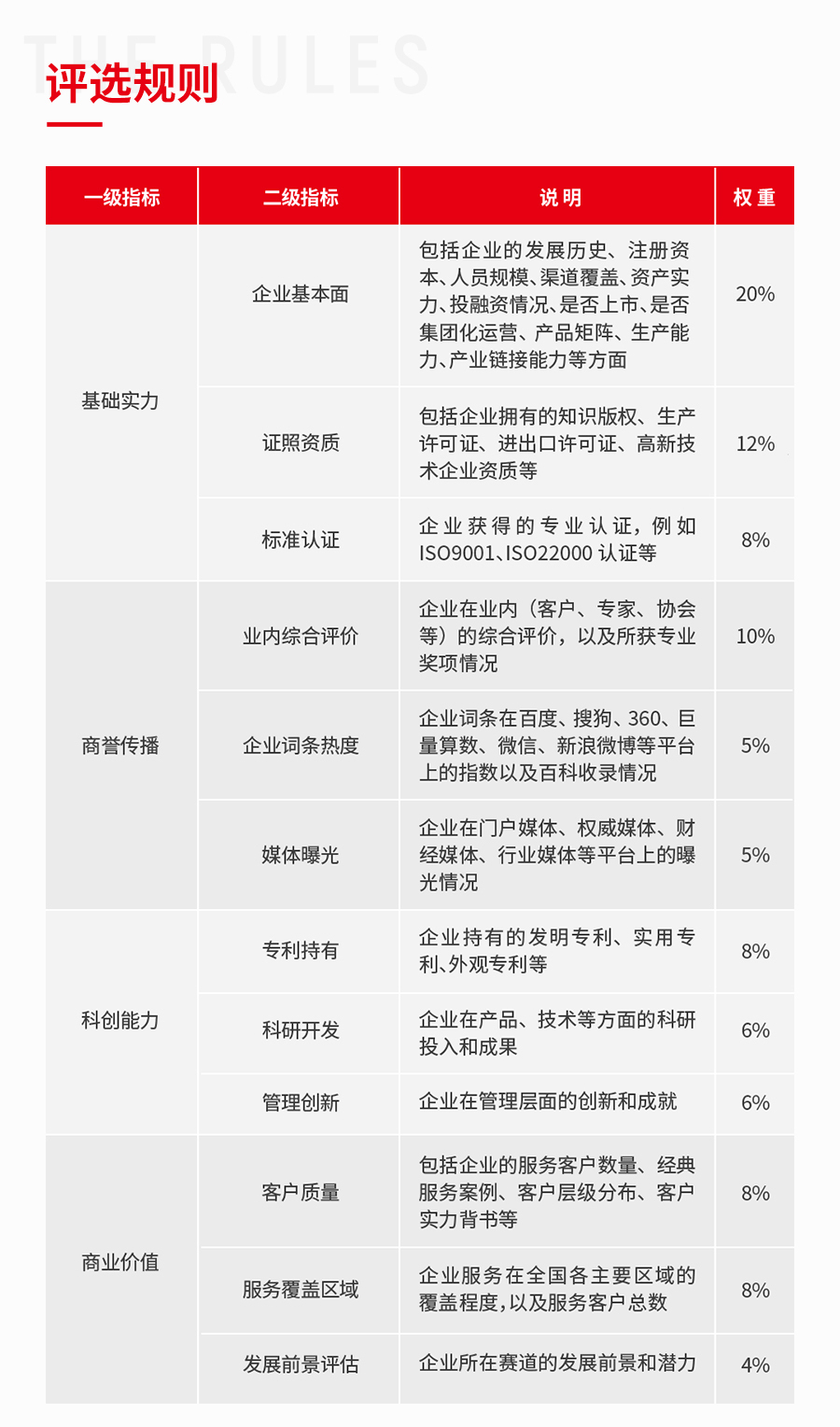 企業榜單的評選規則依據企業的基礎實力、商譽傳播、科創能力、商業價值這四個維度的綜合表現來評選,考量的是企業的綜合實力,力求最終上榜的企業都能實至名歸。