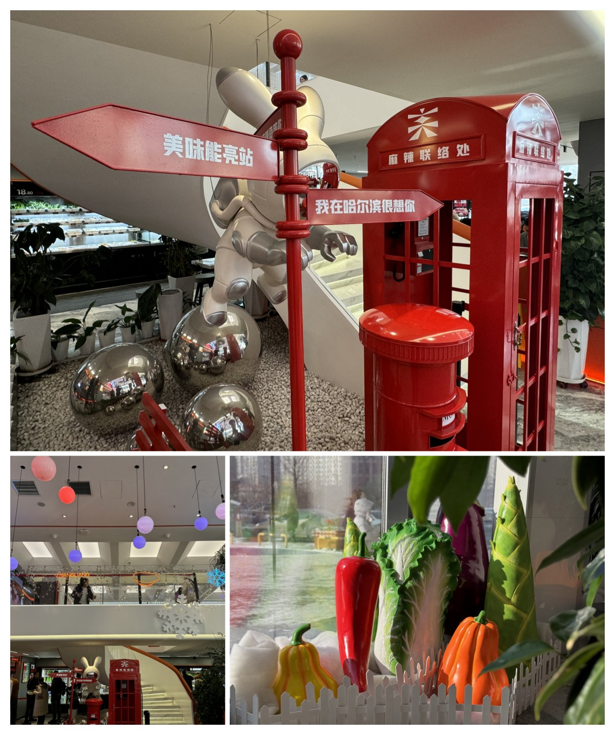 首先,哈西旗艦店從門店外觀到室內佈置全都煥然一新,近3層樓高的玻璃外牆換上了藍白色的套裝,遠遠看去,宛如一座矗立在街頭的“冰雪城堡”。門店內部裝飾也重新裝飾了一番,為了烘托冰雪世界的氛圍感,店內佈置了冰雪裝飾、網紅電話亭、巨型蔬菜裝飾等元素,顧客進店後可以與道具互動,留下極具紀念意義的合影。