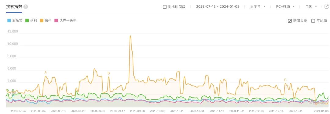 根據百度指數近半年的數據,在蒙牛、伊利、君樂寶、認養一頭牛一眾乳企中,君樂寶的熱度表現並不遜色,不僅持續領先於認養一頭牛,與伊利之間的差距也不算大。