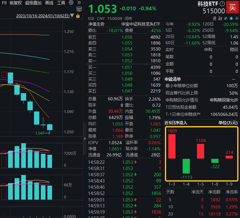 行情雖然較為低迷,但資金面整體表現樂觀。近期多空資金盤踞科技龍頭板塊,博弈連跌後的行情,近5日資金頻繁進出科技ETF(515000),時間拉長看,看多資金仍佔據上風,科技ETF(515000)近20日吸金超1億元!