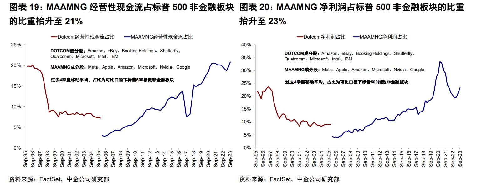 截至2023年3季度,科技龍頭股收入、經營性現金流和淨利潤佔標普500非金融板塊的比重分別抬升至11.5%、21%和23%,顯著高於2000年科技泡沫前的水平。由此,中金公司認為,由於美國增長壓力不大、且滾動式放緩使得納斯達克提前一年在2022年就提前釋放了盈利下調壓力,再加上美聯儲寬鬆的對沖,並不擔心美股的深度調整壓力。