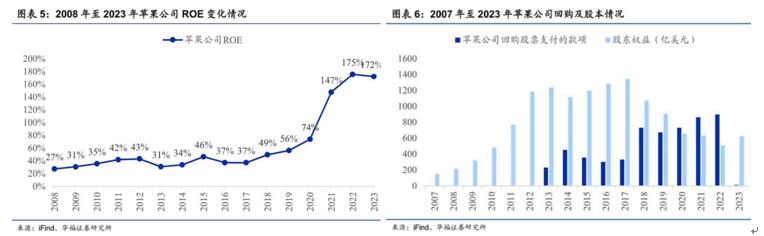 如果單看淨利潤增速,蘋果公司2012財年是417億美元,2023財年是970億美元,期間淨利潤年化複合增速為8%,這一增速對高科技公司來説並不高。但通過大量的股票回購,蘋果公司的ROE從2013年的30%左右提高到了2023年的172%。2021和2022財年,蘋果公司回購普通股的金額分別高達860億和894億美元,幾乎可以抵上當年的淨利潤。