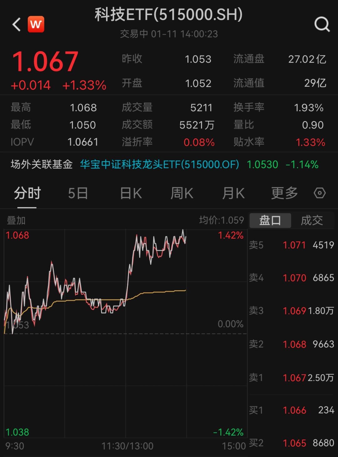 熱門ETF方面,科技ETF(515000)午後震盪走高,現場內價格上漲1.33%,有望終結七連陰!午後成交放量明顯,現實時成交額突破5500萬元!