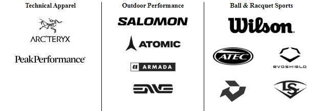 註冊聲明顯示,Amer Sports集團旗下有11個品牌。包括始祖鳥、薩洛蒙、威爾勝、Peak Performance、Atomic、Armada、ENVE、Louisville Slugger、DeMarini、EvoShield和ATEC。亞瑪芬體育將這些品牌細分為“機能服裝”“户外性能”和“球類運動”。每個細分市場均由其核心品牌之一領導:始祖鳥、薩洛蒙和威爾勝。