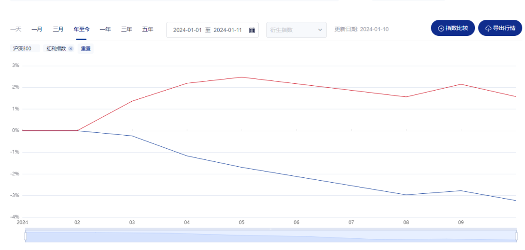 滬深300指數和紅利指數今年來走勢圖 來源:中證指數官網 數據截至:2024/1/11
