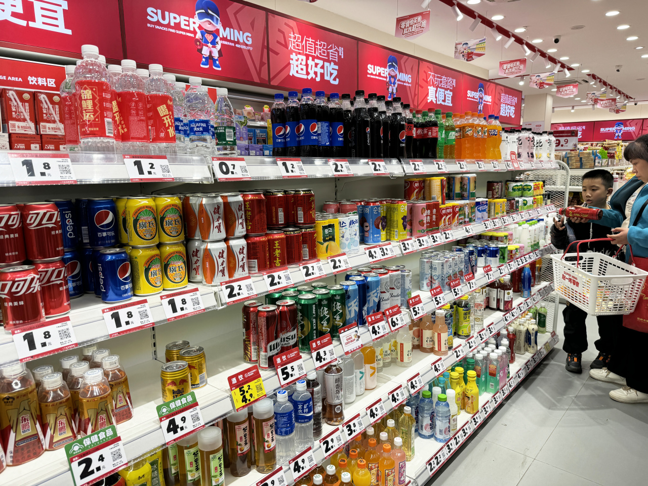 貨架上種類豐富,乳製品、烘焙產品、膨化食品、糖果、肉乾、方便麪等應有盡有。在一排排貨架間擠滿了人,隨時都能聽到父母和孩子討價還價,“買完這個就不買了啊”。