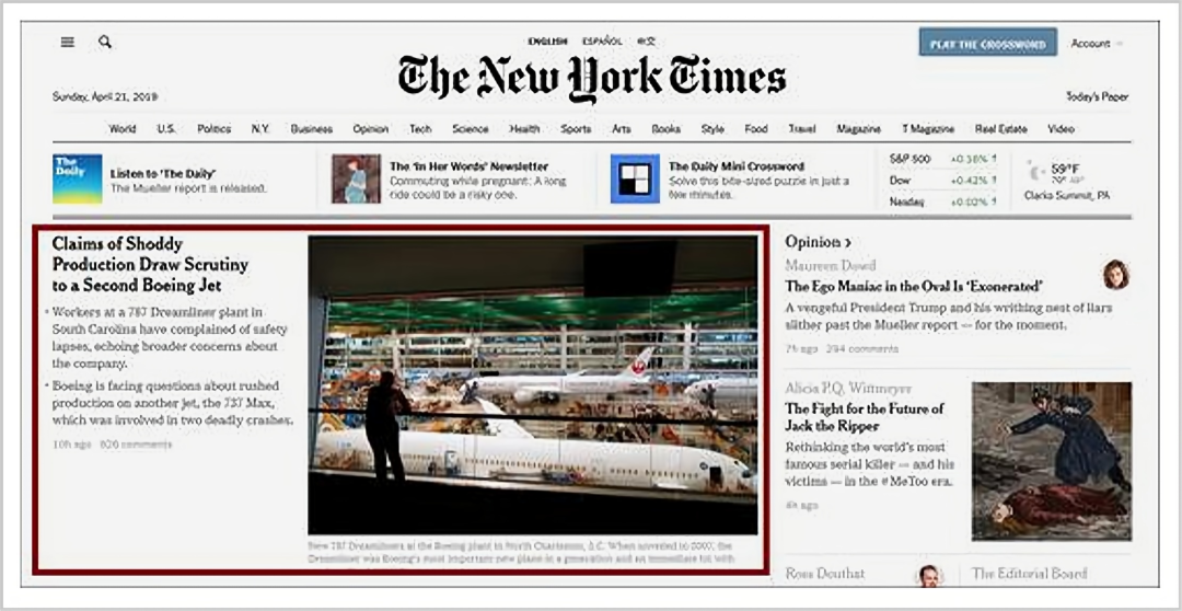 2019年4月,《紐約時報》頭版頭條就曝光了波音的787夢想飛機工廠,生產監督管理存在嚴重問題,所以生產的飛機有很大隱患。