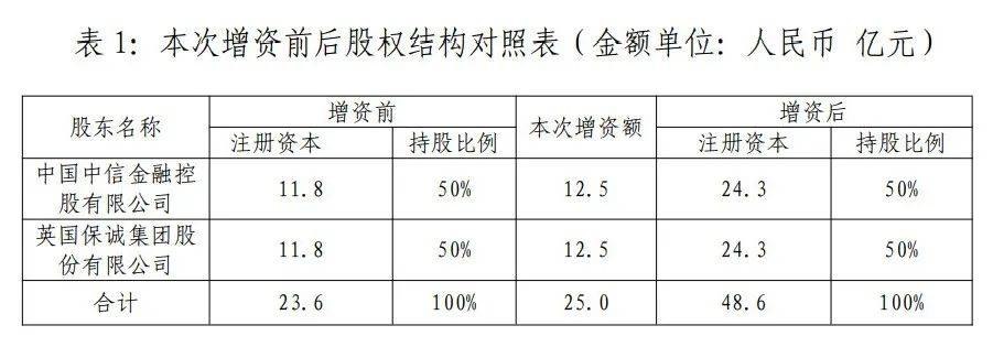 本次增資,中信保誠人壽擬增加註冊資本人民幣25億元,增資後,中信保誠人壽註冊資本將由人民幣23.6億元增加至人民幣48.6億元。其中,中信金控合計出資人民幣24.3億元註冊資本,保誠集團合計出資人民幣24.3億元註冊資本。