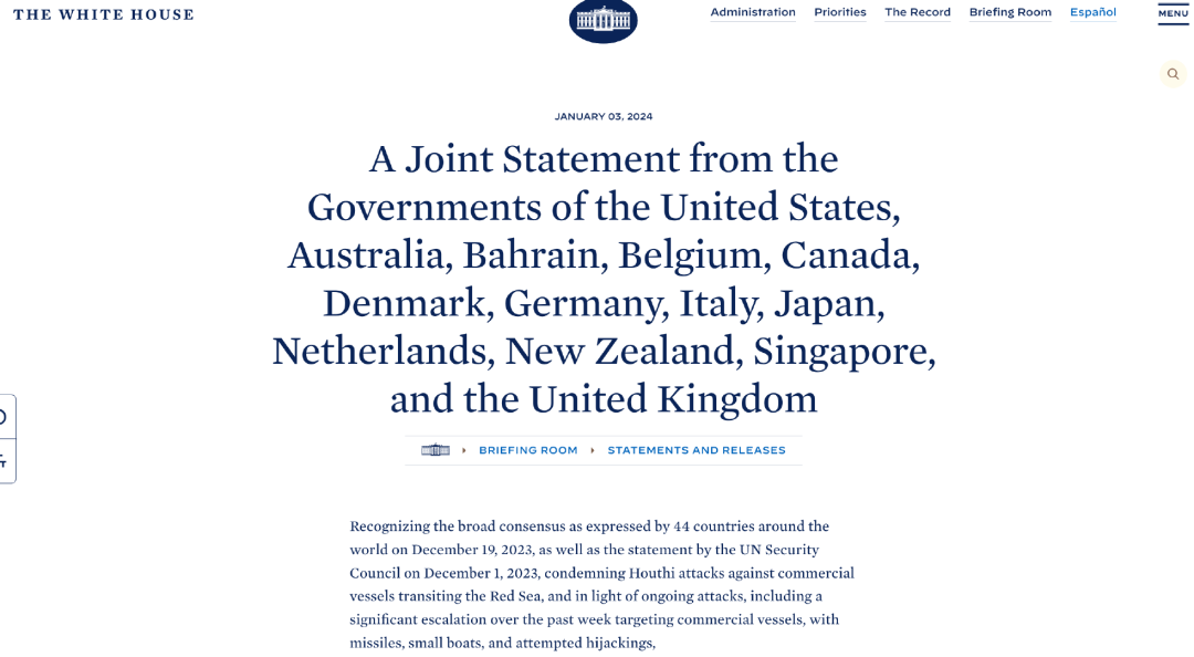 1月3日,美國、英國、日本等13國簽署聯合聲明,向胡塞武裝下達最後通牒:“如果胡塞武裝繼續威脅生命、全球經濟和該地區關鍵水道的商業自由流動,他們將承擔後果。”13國放狠話,顯然沒什麼效果。