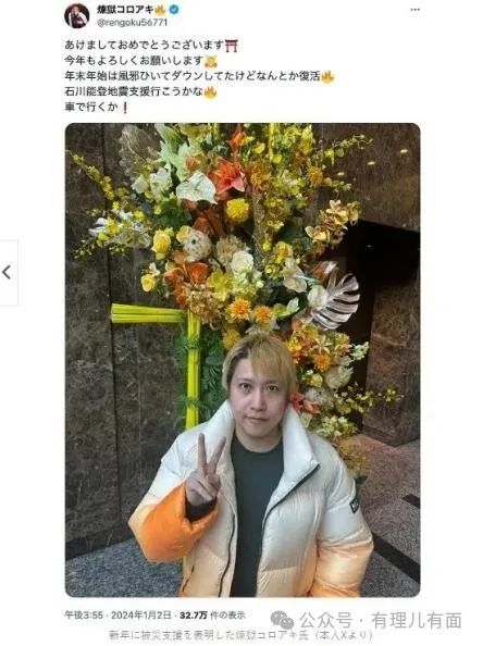 但這還不是日本民間最奇葩的“救援”。曾因當街暴打女孩而被逮捕的日本網紅“煉獄コロアキ”,在2023年12月底出獄後一直想着再度炒作以爆紅網絡。正逢1月1日能登半島地震,於是1月2日在其社交平台上以“剛剛出獄,沒有錢”為由,呼籲日本網友給他的團隊支付租車費、汽油費、餐費、酒店費和生活費,並公開匯款賬户,讓大家給他募捐救災物資。