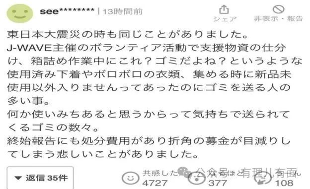 話説回來,這也並不是個例。有網友表示,2011年日本東北地區大地震時也發生過類似的事情。當時,該網友參加了J-WAVE組織的志願者活動,主要工作就是做救援物資的分類。在裝箱的過程中,該網友無數次看到有人將穿過的內衣和已經破爛的衣物放進箱子。而明明在接收捐贈時就曾説過“不能放新品以外的東西”,但把不合格衣物放進箱子的人還是很多。最終,這些不合格衣物不僅要被當作垃圾處理,還要從給災區的捐款里扣掉垃圾處理費用。