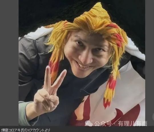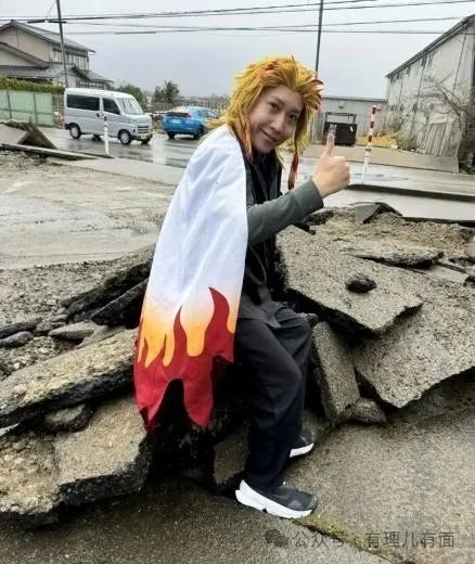 更過分的是,這名網紅藉着“救援”的名義,在災民家破人亡的地方玩起cosplay,裝扮成漫畫《鬼滅之刃》裏的角色煉獄杏壽郎,坐在一片廢墟里,豎大拇指拍照。
