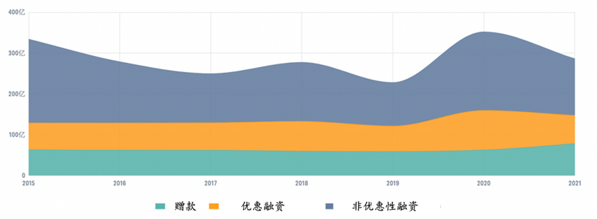 在2015年至2021年間,東南亞累計吸收了約2000億美元的海外資金,年均約為280億美元。這些資金主要流向該地區的新興和發展中經濟體,總額大致相當於這些經濟體的集體國內生產總值的1%。其中,超過一半的資金來自經濟合作與發展組織定義的官方資金流動(OOF),包括中國國有政策性銀行和兩大多邊開發銀行提供的非優惠貸款。其餘的官方開發融資以贈款和優惠融資形式提供。