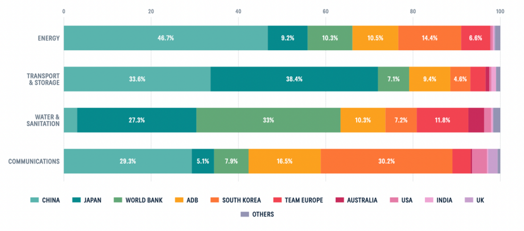 日本位列第二大基礎設施官方發展基金來源國,每年提供25億美元。相較之下,世界銀行、亞洲開發銀行及韓國每年各提供略高於10億美元的資金。法國和德國位居第二大來源國,加上其他歐盟國家組成的“歐洲團隊”,成為第六大基礎設施官方發展基金來源國。後續依次為澳大利亞、美國、印度和英國,但每年提供的資金支持遠低於1億美元。