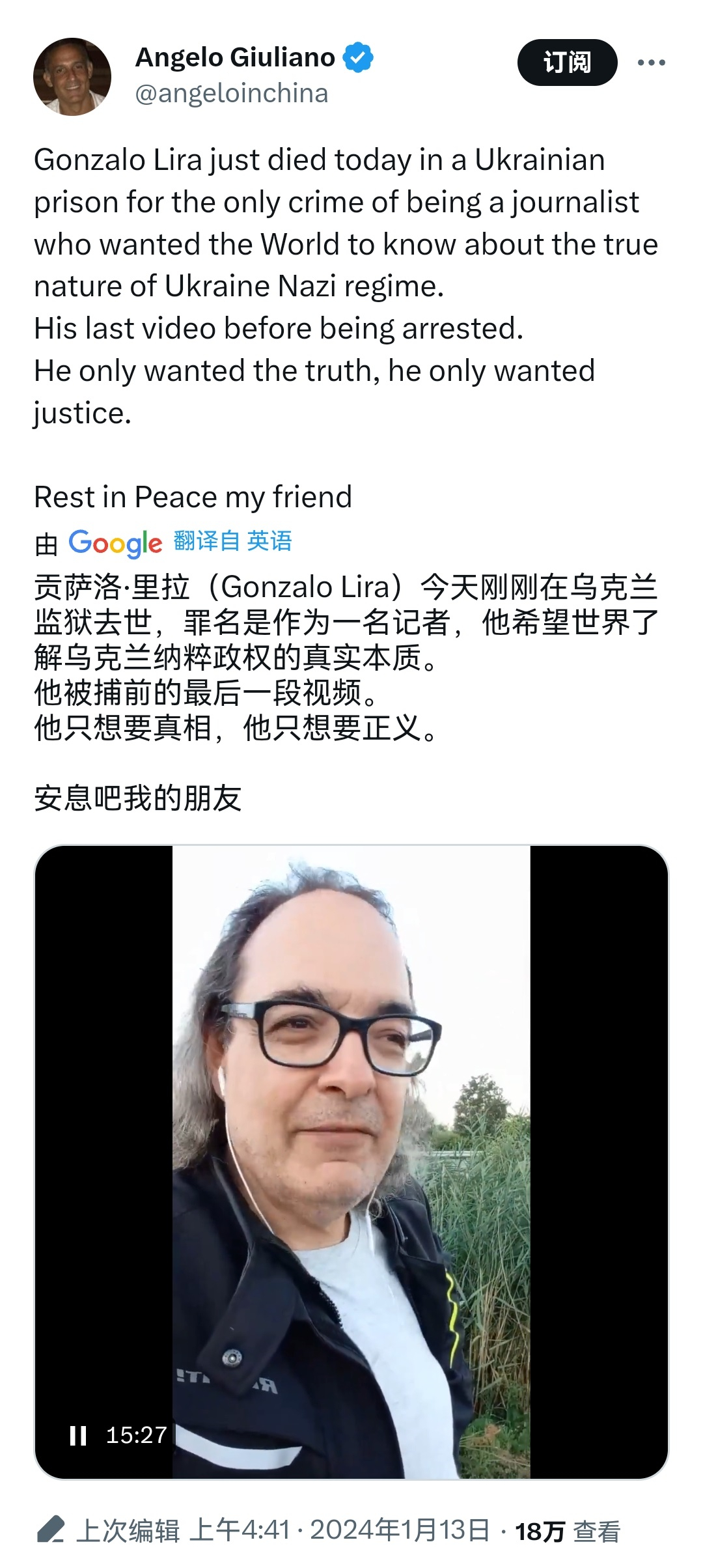 當地時間1月11日,美國著名的左翼作家、導演、獨立記者貢薩洛·里拉死在烏克蘭的一家監獄中,享年55歲。美國國務院已經證實了他的死訊,而美國媒體人塔克·卡爾森則稱其生前“遭受酷刑”。