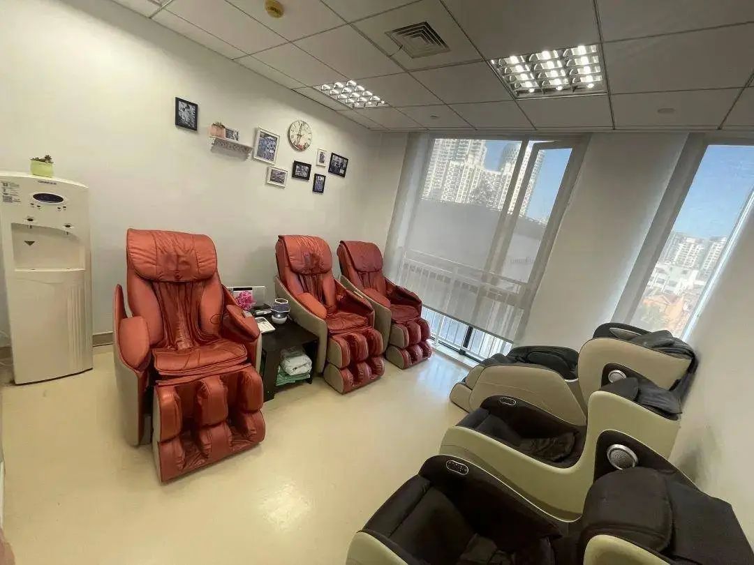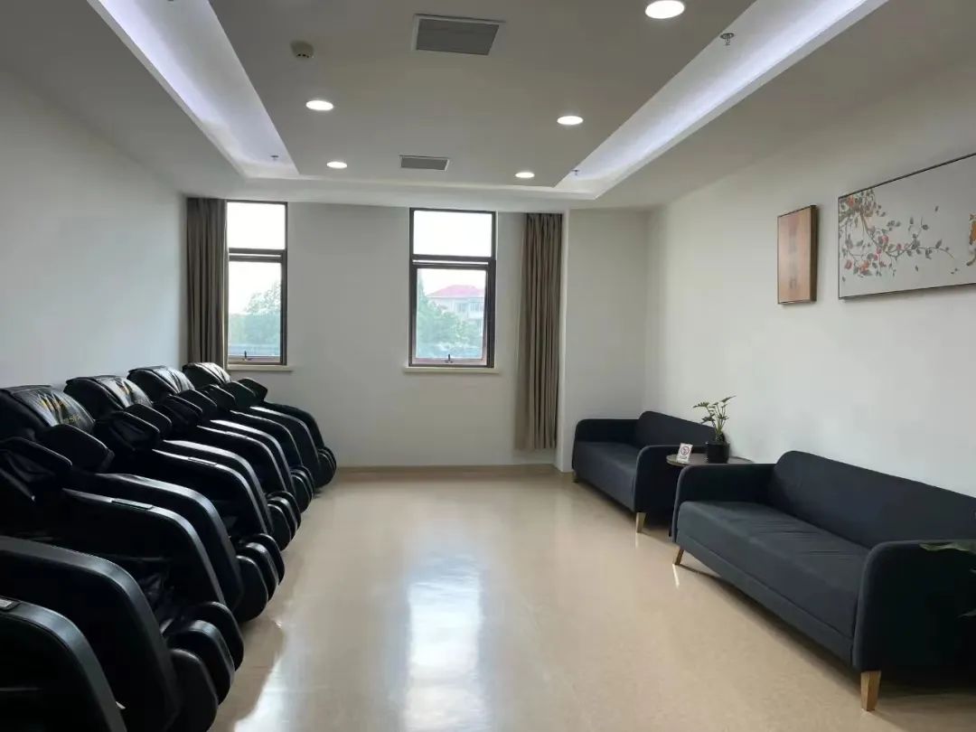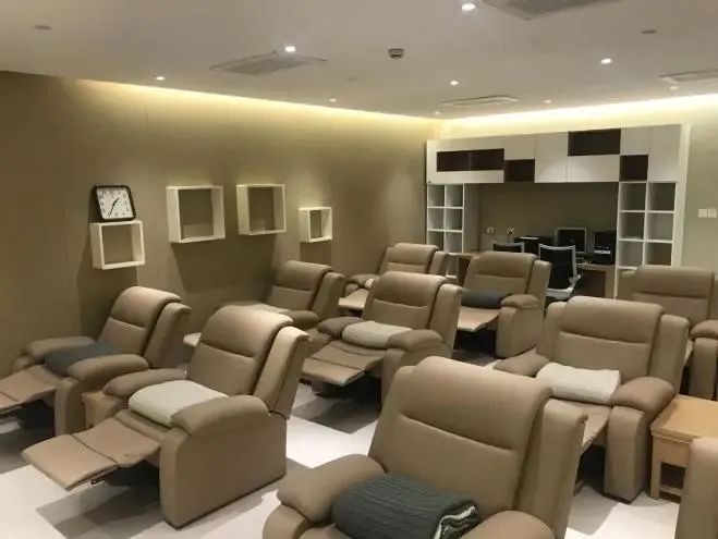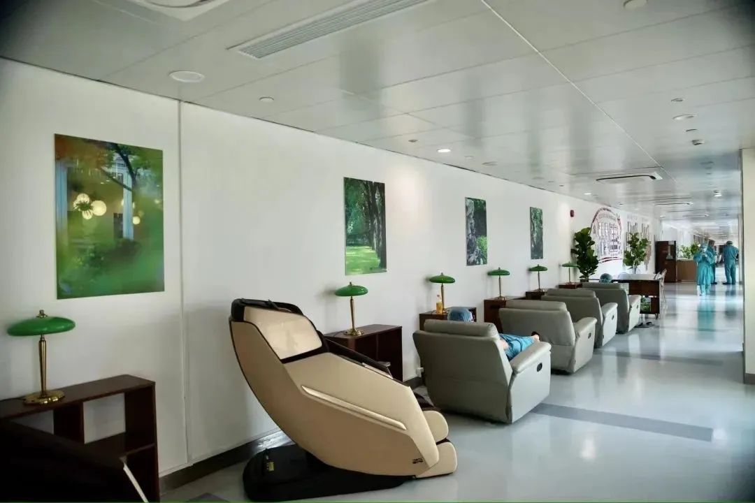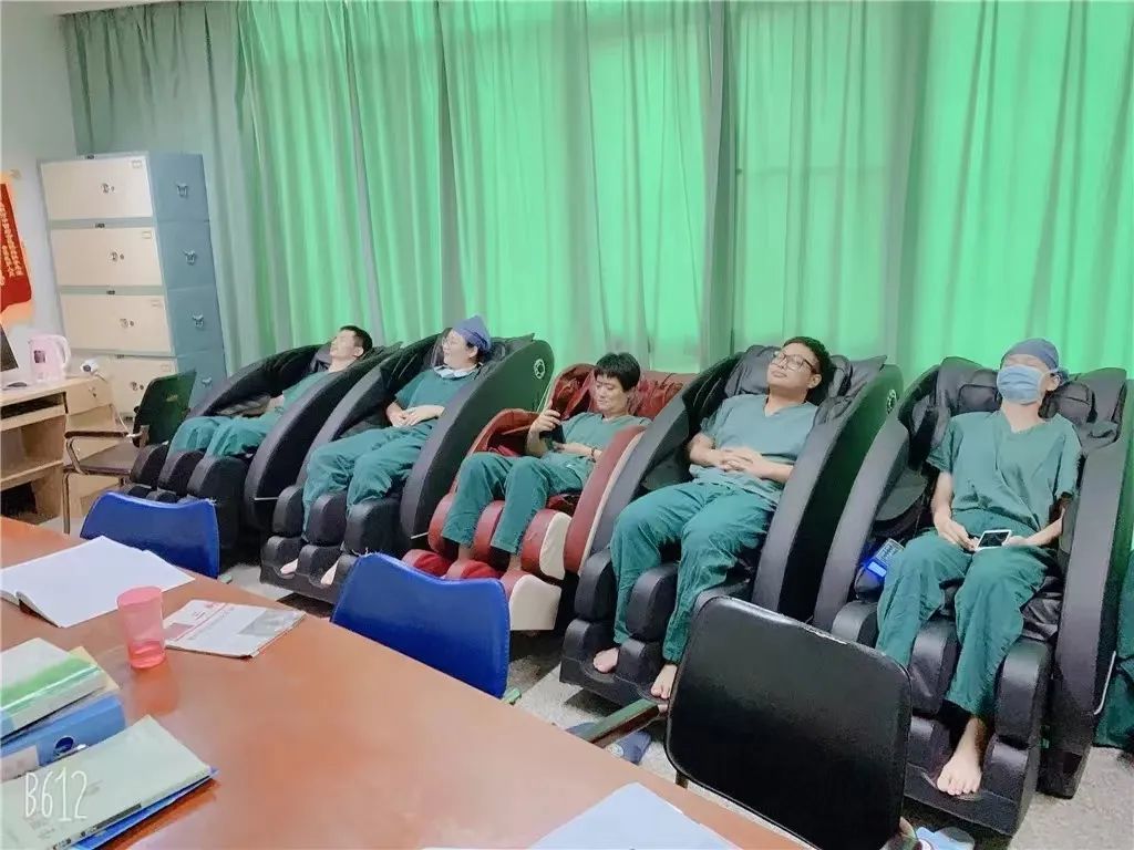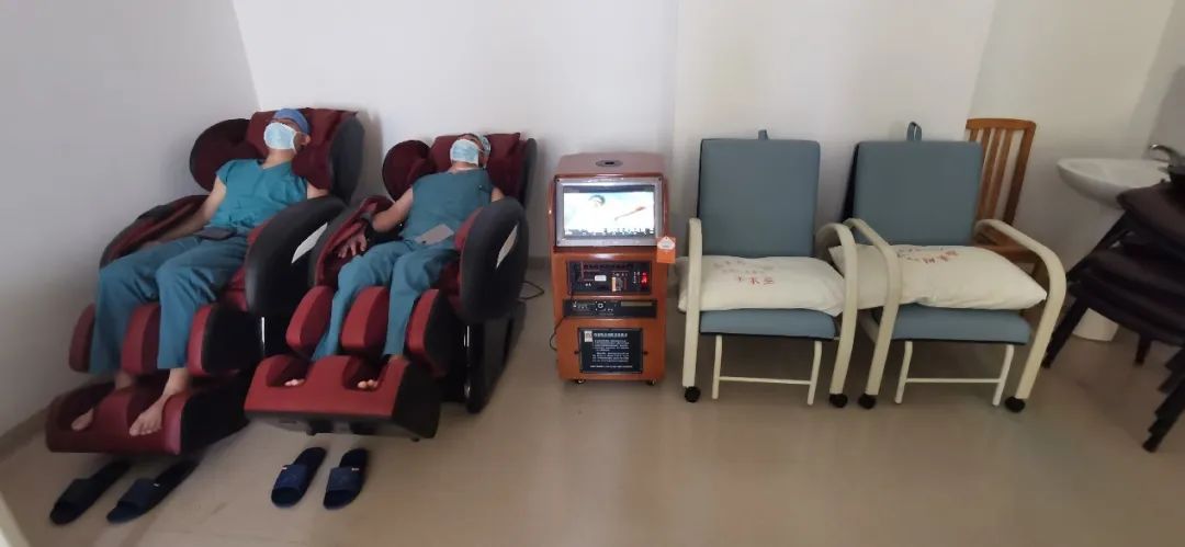 上海市第五人民醫院的手術室休息區則將按摩椅和長沙發“面對面”。這邊按舒服了,那邊原地躺倒,細節滿分。