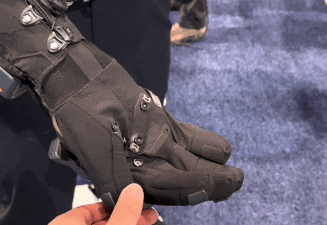 不過有一些VR的外設還是很有意思的,比如這家叫做bHaptics的韓國公司。我之前買過他們家的VR夾克,在VR遊戲你可以感覺到你中彈了。這次他們帶來了一款VR手套,你可以在VR裏面感受到細節的觸感,完成精細的手指動作,這樣整個體驗會更加沉浸。做VR外設外設的公司不少,這家bHaptics我覺得是做得最好的。