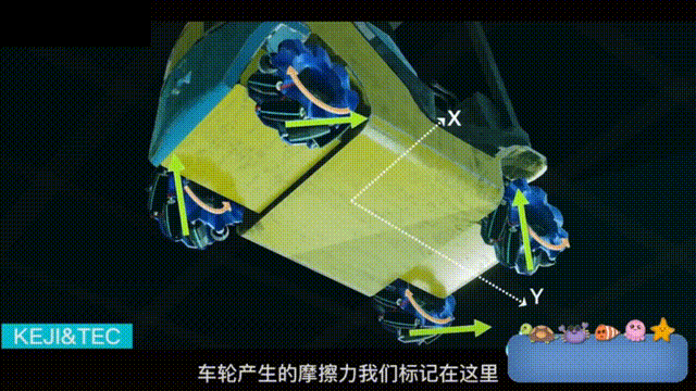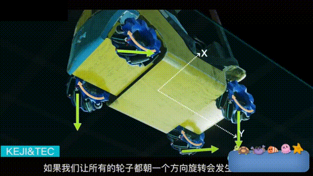 如果你讓所有輪子都向一個方向旋轉,那麼橫向X軸上的摩擦力就會互相抵消,在這個方向上不做功也不消耗能量,所有摩擦力集中在前進方向Y軸上,此時車輛就會正常前進。