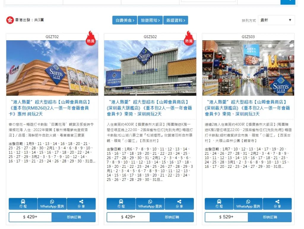 至少有7家旅行社,都推出了“山姆超巿純玩短線團”,標榜有食有住有景點,重點是山姆超巿購物,開團即爆滿。