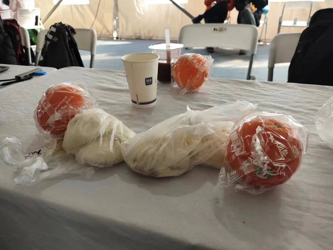 這次觀禮是在一個小島上,物資並不豐富,所以只有一些簡餐用來飽腹。同行的媒體老師,每個人都可以領取2****個包子,1個橙子,一杯粥。領取的時候,還特地叮囑我們説“這是一個老傳統”,包子和橙子連在一起,寓意着**“包成功”。今天早上登船檢查火箭的同事們**,也都是吃了包子和橙子。