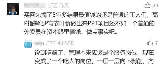 在這樁可能的收購案中,值得關注的除了價格,還有人員的安排。本次傳聞提到,字節希望只承接即時配送團隊,而阿里希望全部打包,之後再由字節按需裁員。對此,有網友表示,這除了説明大廠裁員的“新常態”以外,還表明:在資本眼裏,做PPT的還不如一個普通外賣員值錢。