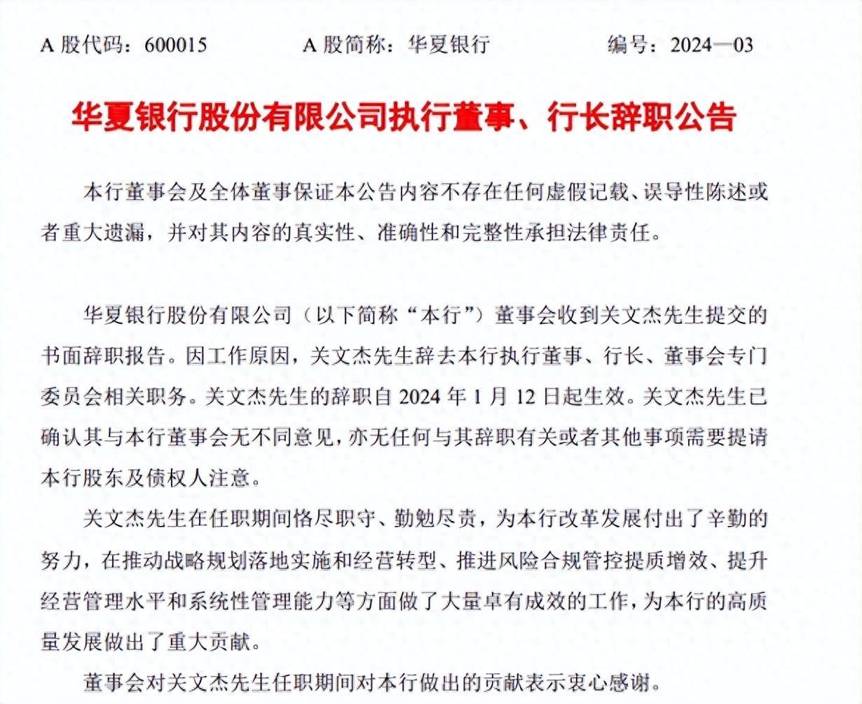 1月13日,據華夏銀行公告,董事會收到關文傑提交的書面辭職報告。因工作原因,關文傑辭去本行執行董事、行長、董事會專門委員會相關職務,關文傑的辭職自2024年1月12日起生效。