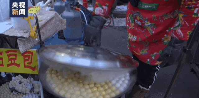 旁邊的一個攤位是賣東北黏豆包的,鍋蓋一開,熱氣撲面而來,攤主説,“現在南方遊客多了,一天能賣空三鍋吧,一鍋有一百一二十個。”