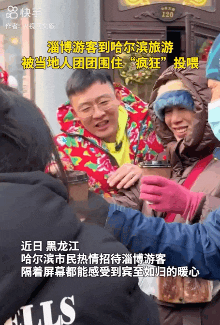 下一秒,這位來自淄博的遊客被熱心的哈爾濱人團團圍住瘋狂投餵,見她手裏拿不下,他們又拼命往她兜裏塞,一邊送一邊對她説: