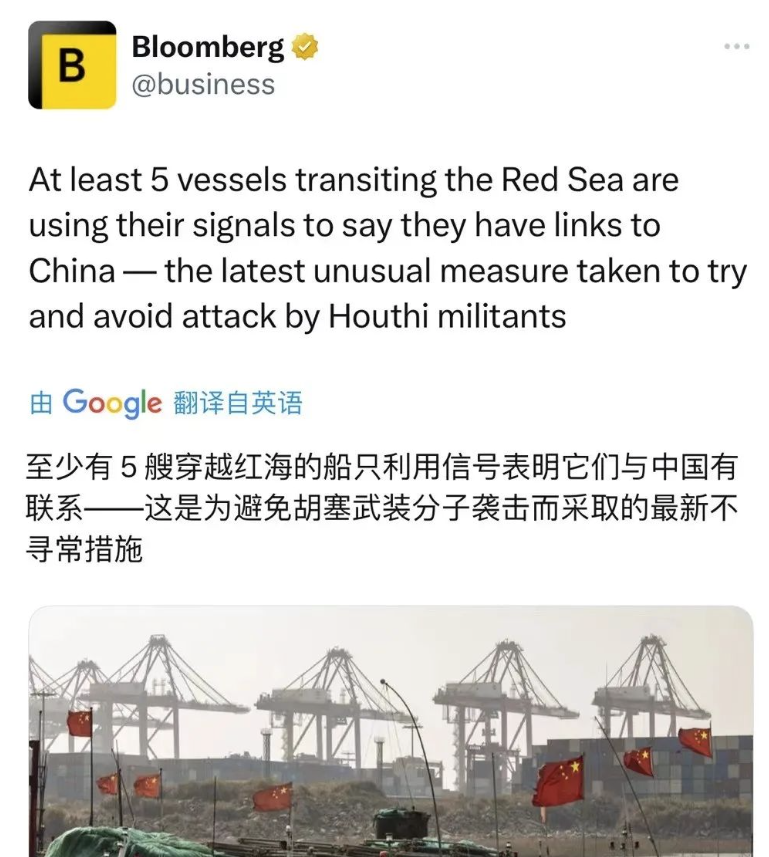 説到底,這是那些船商自己的選擇,並非什麼中國建議。商人是很精明的,他們看得很清楚,目前紅海的“通行證”有兩張,第一張是自證清白,你得拿出讓胡塞武裝願意看、看得懂的證據,證明自己與以色列無關。而第二張就是“CHINESE”,把自己的船多多少少與中國扯上點關係,相當於買了雙重保險,那在紅海通行會安全得多。