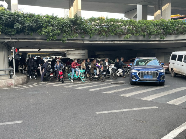 機動車喇叭不停,催促着本不該在出現的電動自行車儘快駛離機動車道。出行一客(ID:carcaijing)剛來到中山一立交,見到的就是這樣的場景。