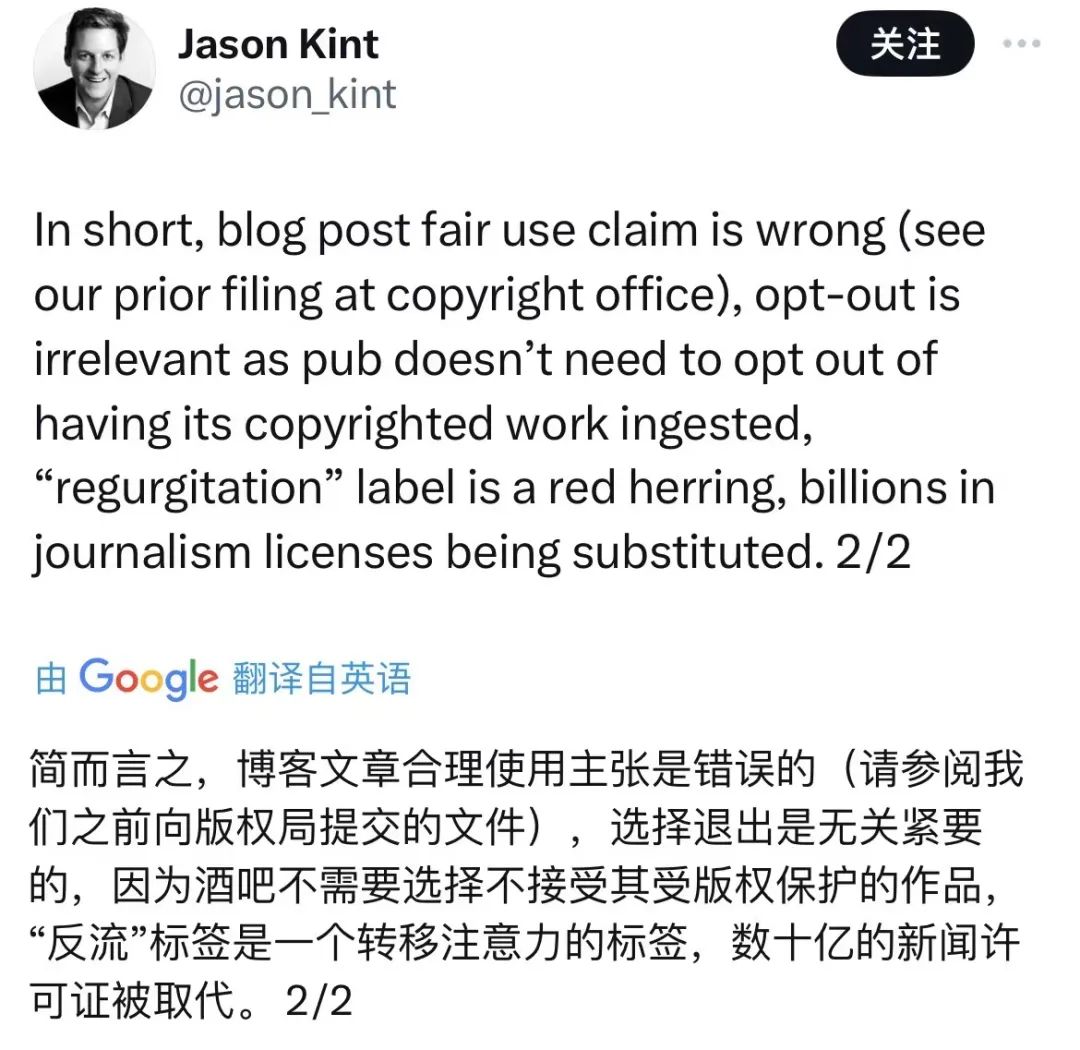 紐約時報剛交起訴書的時候,就有國外知名媒體人 Jason Kint 連發了十幾條推文為它發聲。