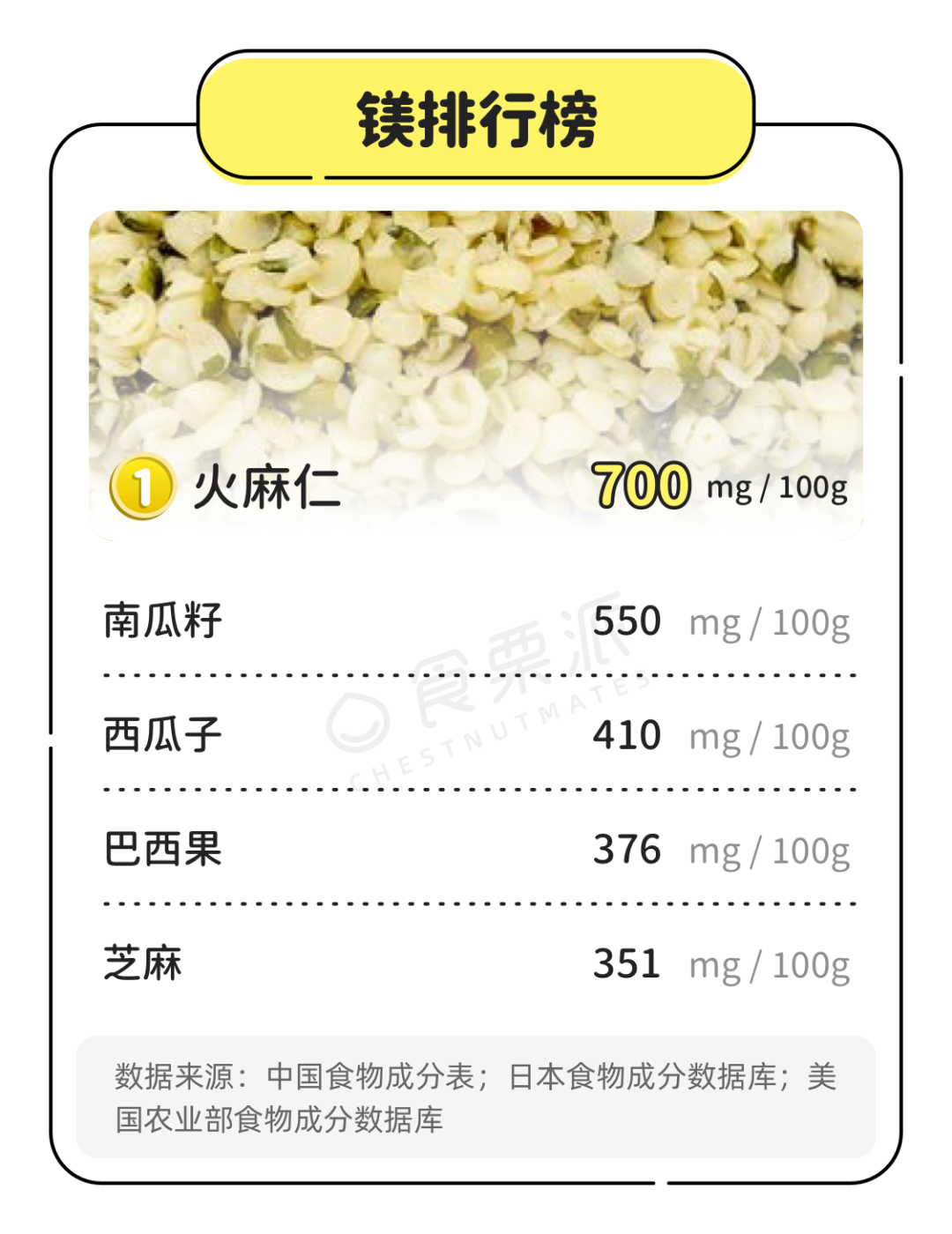 除了上榜的5位,松子、花生、奇亞籽、榛子、杏仁的鉀含量也都很豐富,在600mg/100g以上。