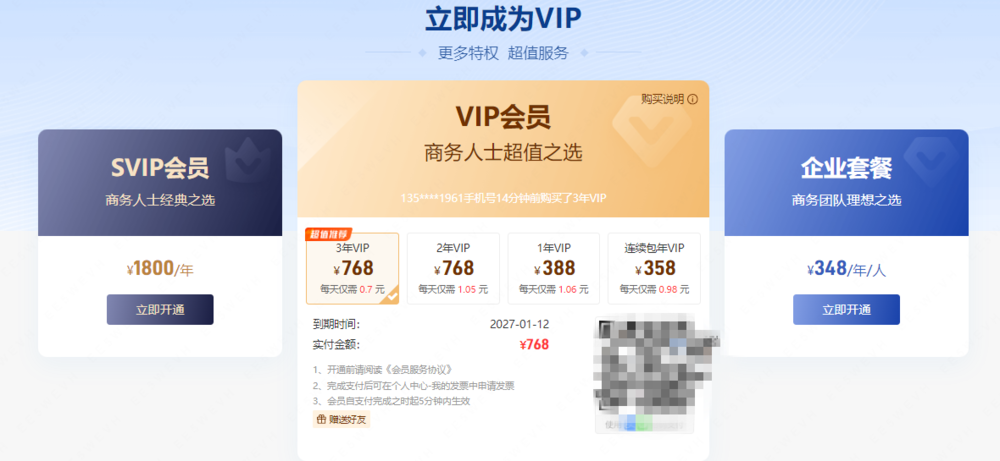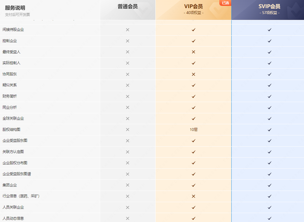 而且企查查、天眼查面向ToC端的會員普遍以一年、兩年、三年為主,這和長視頻平台、音樂平台推出的月卡、季卡有所不同。較長的會員週期下,意味着單個會員一旦購買其他企查查3年VIP會員的話,必然不考慮購買其他平台會員,其他“查查們”將愈發被動。