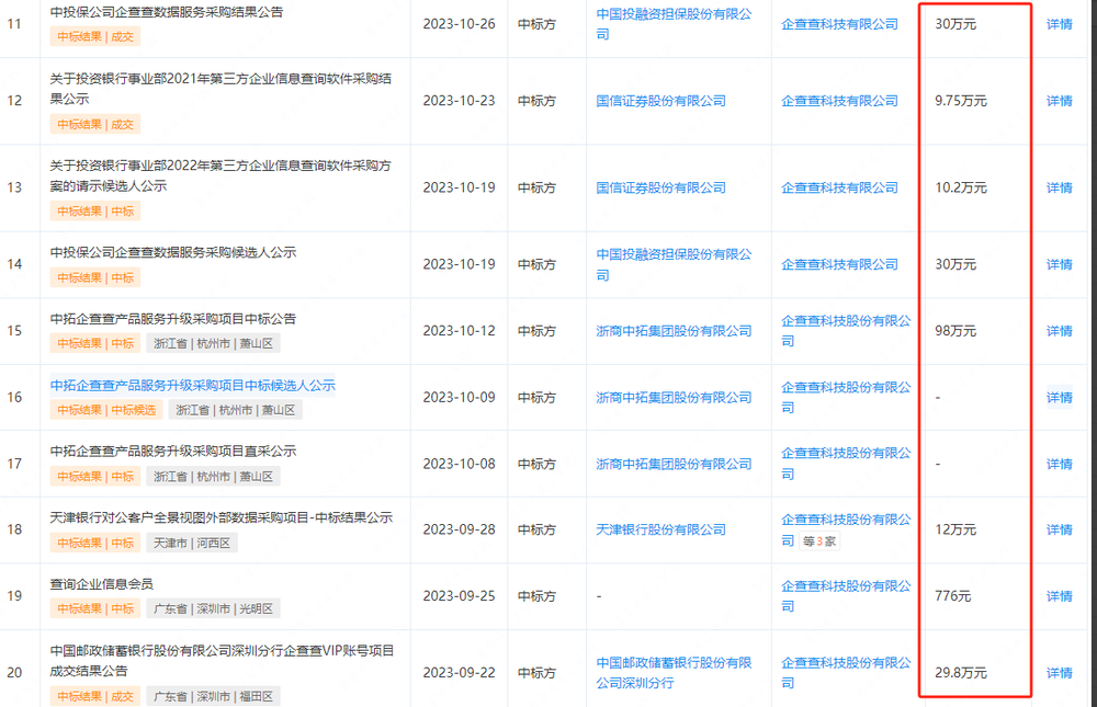 同樣的還有企查查上面展示的招投標信息,一條招投標數據可能就影響上千萬、上億的交易,其內部堡壘能否持續扛得住外部公共關係巨大的誘惑呢?