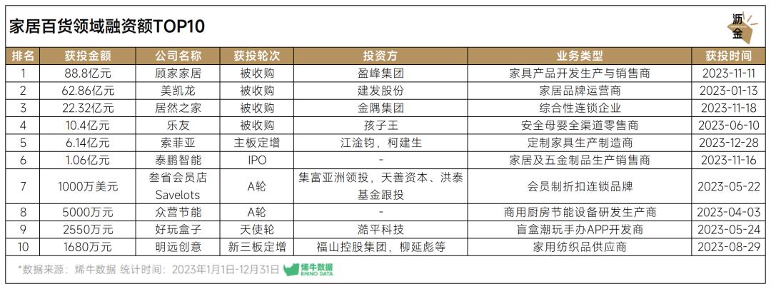 家居百貨賽道併購潮起,去年融資額TOP10中共有4家企業被收購,分別是做顧家家居、美凱龍、居然之家和做母嬰全渠道零售的樂友。