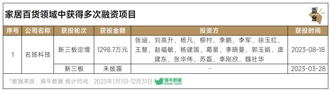 和其他類目不同,家居百貨領域在年內多次獲得融資的品牌僅有名揚科技,它是從事窗簾研發設計、生產加工和銷售的大型出口型企業,在3月獲得新三板投資後,又於8月獲得數千萬元新三板定增融資。