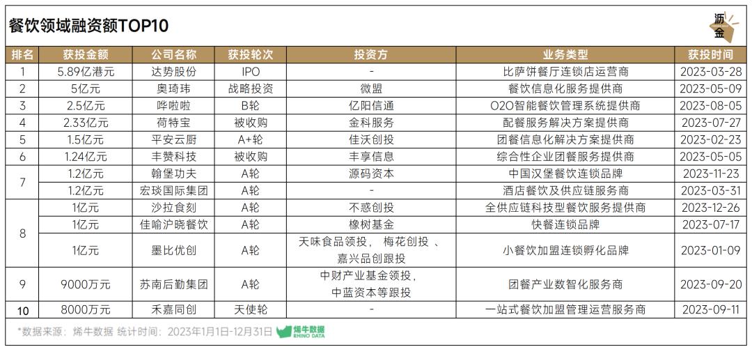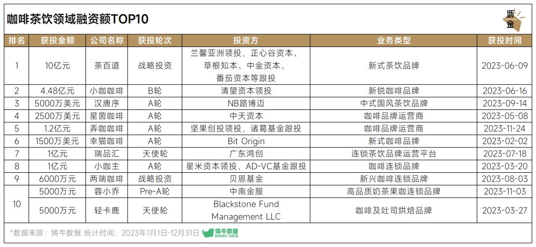 **2023年的咖啡融資仍未熄火,在咖啡茶飲領域融資額TOP10裏佔比過半,且咖啡品牌在不斷做加法,果咖、茶咖、咖啡+烘焙等融合其他元素的品牌易拿到投資。**而茶飲賽道中,新式茶飲品牌“茶百道”以10億元大額戰略投資位居榜首。
