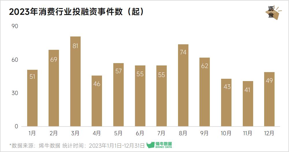 之後月份投融資事件數量保持一個較低水平,直至8-9月份短暫回暖,而年末消費市場整體融資遇冷,10月至12月投融資事件數量均不足50起。