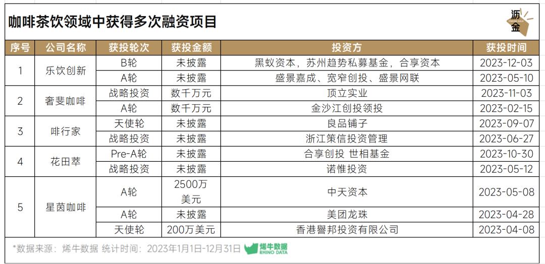 該領域獲得多輪融資的企業包括:星茵咖啡專做中國本土特色的茶咖,去年4、5月份內獲得3次獲得資本青睞,獲投數萬元;樂飲創新專做精品咖啡供應鏈,為B端客户提供精品咖啡研發生產一站式服務。