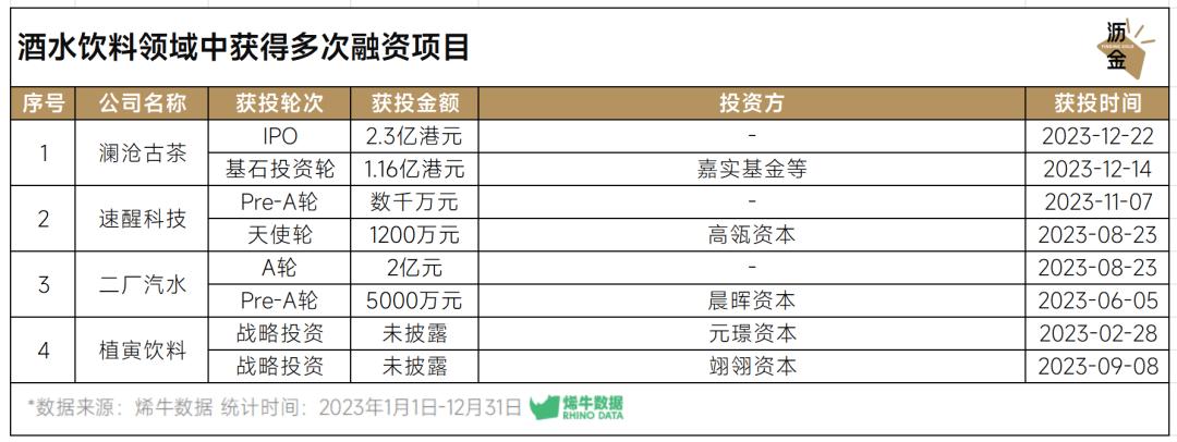 在酒水飲料領域融資額TOP10中,僅有3起融資為酒類企業,投資輪次大多集中在茶水果汁。