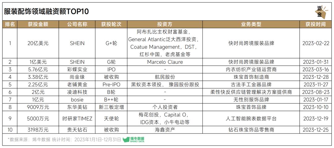 作為主營快時尚跨境服裝的SHEIN獲Marcelo Claure的1億美元投資後,又獲得阿布扎比主權財富基金、紅杉中國等資方的20億美元G+輪投資;內衣紡織產業鏈運營商彩蝶實業則憑藉有完整的紡織產業佈局,涵蓋滌綸紡絲、織造、染色等多項業務,具有較強的產業鏈競爭優勢商也獲得了數億元投資。