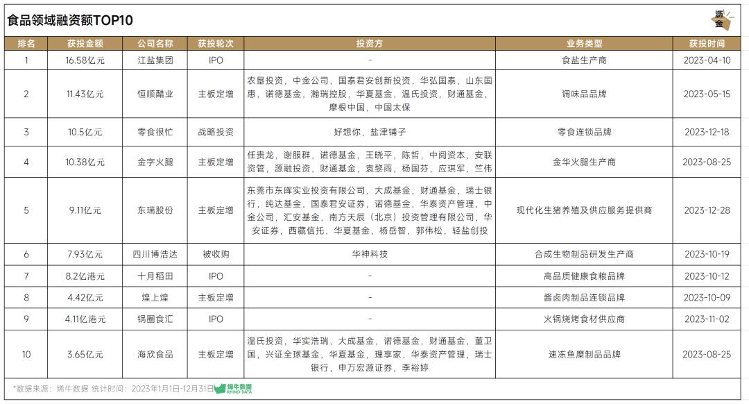 2023上半年,食品的鉅額融資主要集中在調味品和食用油等供應鏈企業,其中,中糧福臨門拿到了全年最高的一筆投資;