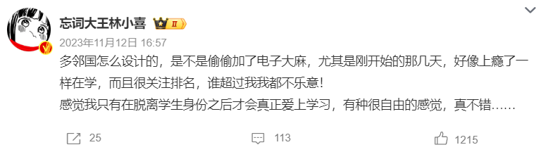 反觀用多鄰國學習,簡直令人痴迷,有人即便是燒了一天,也堅持先學一手,守護自己的連勝↓↓