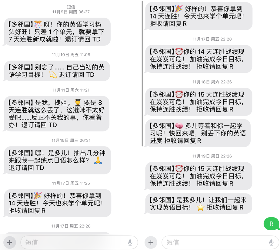 這哥們還提到了一個很有趣的發現,如果 “ 多兒 ” 給用户連發七天消息都沒用的話, “ 多兒 ” 就不會再推送了,它會發消息説, “ 看來這些消息沒用,那以後我就不找你了 ” 。
