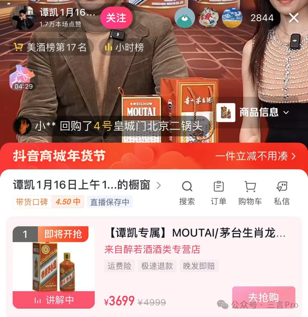演員譚凱直播間,同款龍茅售價也是3699元,顯示已售1130,商品也來自醉若酒酒類專營店。