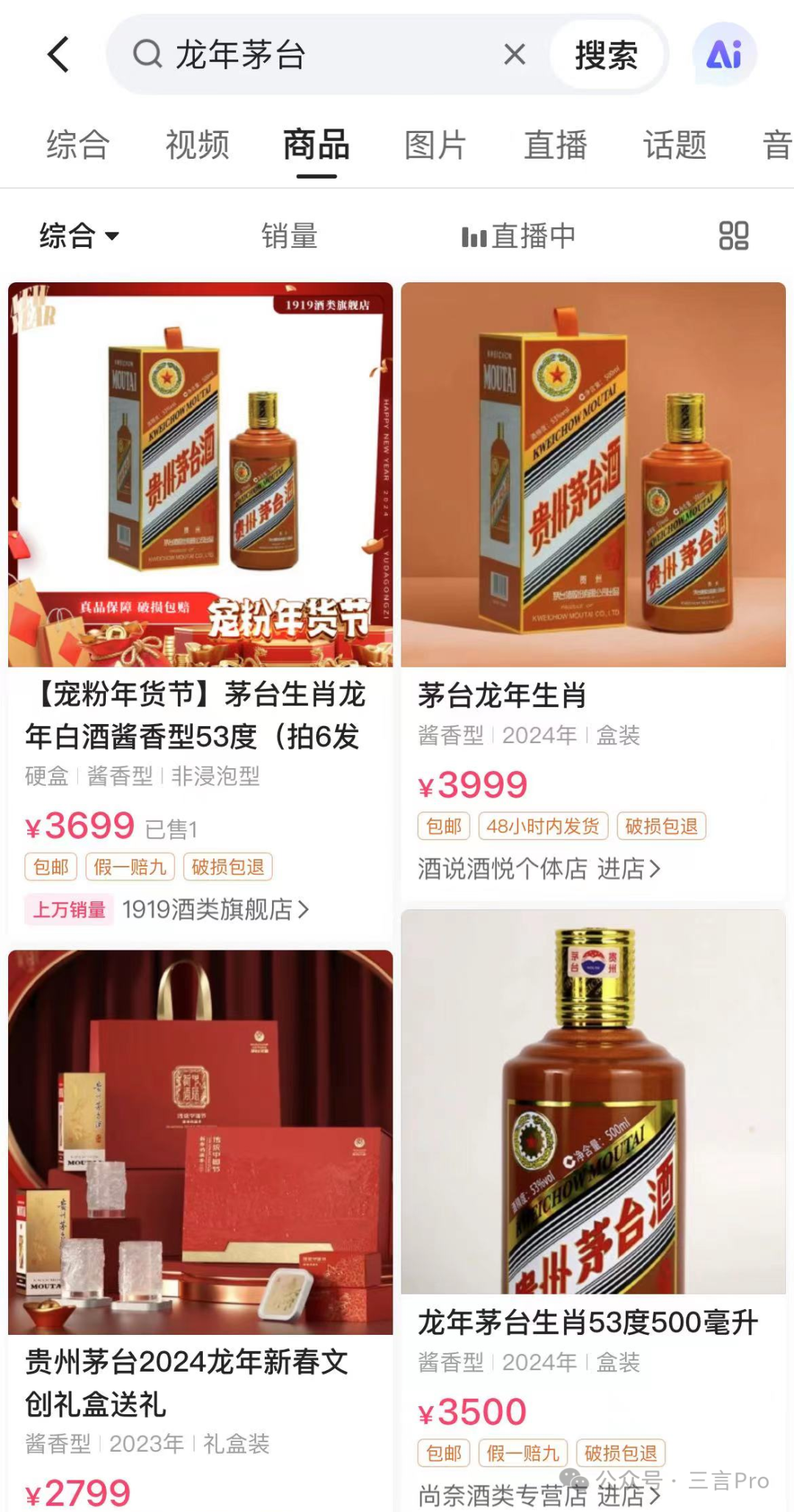 三言還發現,在很多直播間裏,以及電商平台上,茅台的種類五花八門,各種生肖茅、小瓶茅,不同包裝的、不同度數的……