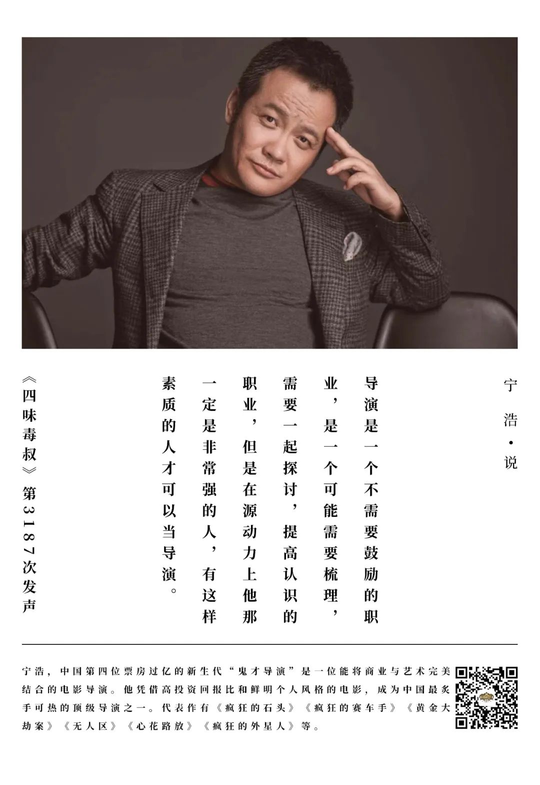 **甯浩:**我其實沒有什麼好説的,以前他們問我説:你給新導演有什麼建議?我的建議就是沒啥建議。我老覺得一個導演還需要另外一個導演鼓勵他,就別當導演。導演是一個不需要鼓勵的職業,是一個可能需要梳理,需要一起探討,提高認識的職業,但是在源動力上他那一定是非常強的人,有這樣素質的人才可以當導演。