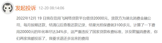 還有消費者投訴湖北銀行“聯合信用飛欺騙消費者,砍頭利息”,其於12月 19 日在信用飛網絡貸款平台借貸20000元,放款方為湖北消費金融公司,每月按期還款,結清以後查看還款記錄,其中擔保費高達3100多元,費用的年化率超34%。