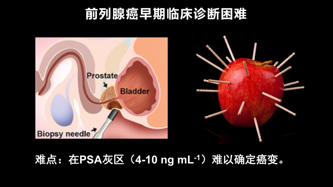 那如果是為了避免病人誤診,一般會建議去做穿刺活檢,那活檢對一個前列腺來講,最早期要插13針上下左右,現在可以最多插到40針,大家可以想象0.5毫米直徑的一個針來取組織,那帶來的痛苦就不言而喻了,這裏邊還有可能帶來其他的過診、過療,也有可能帶來轉移,那個該怎麼辦?有沒有好的辦法,能不能抓剛才的進入循環系統的這些腫瘤處細胞出來,幫助這個診斷真的解決臨牀的難題。