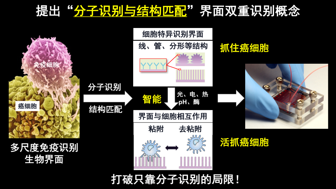 於是我們就提出了一種新的設計理念,就生物芯片這個界面應該怎麼設計,應該打破傳統只靠分子識別這個事,我們團隊把分子識別與結構匹配界面雙重識別的概念提出來了,這樣就可以高效率的來把癌細胞抓出來,並且為了後續的單細胞分析和單細胞的藥物篩選,我們需要活捉癌細胞。